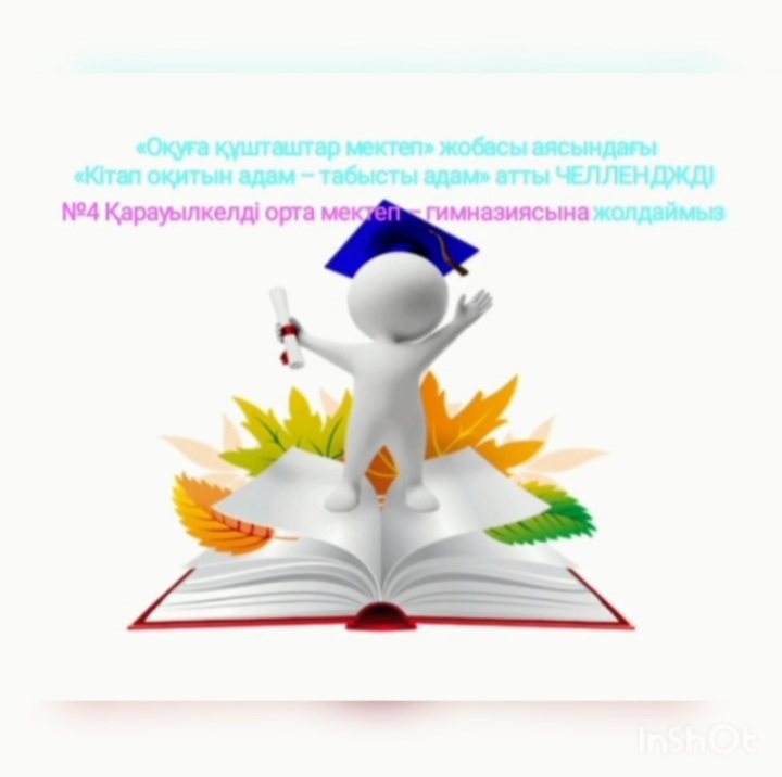 «Кітап оқитын адам – табысты адам» атты челлендж. Байғанин ауданы, Қарауылкелді орта мектебінің оқушылары «Оқуға құштар мектеп» жобасы аясында ақын – жазушылар мен әдебиет майталмандарының еңбектерін насихаттау мақсатында «Кітап оқитын адам – табысты адам» атты челленджге  белсене қатысты.Челлендж мақсаты: Оқушыларды кітап оқуға ынтасын арттыру, кітап оқу мәдениетін қалыптастыру. «Кітап оқитын адам – табыс адам» атты челленджді №4 Қарауылкелді орта мектеп – гимназиясының кітапханасына жолдадық.